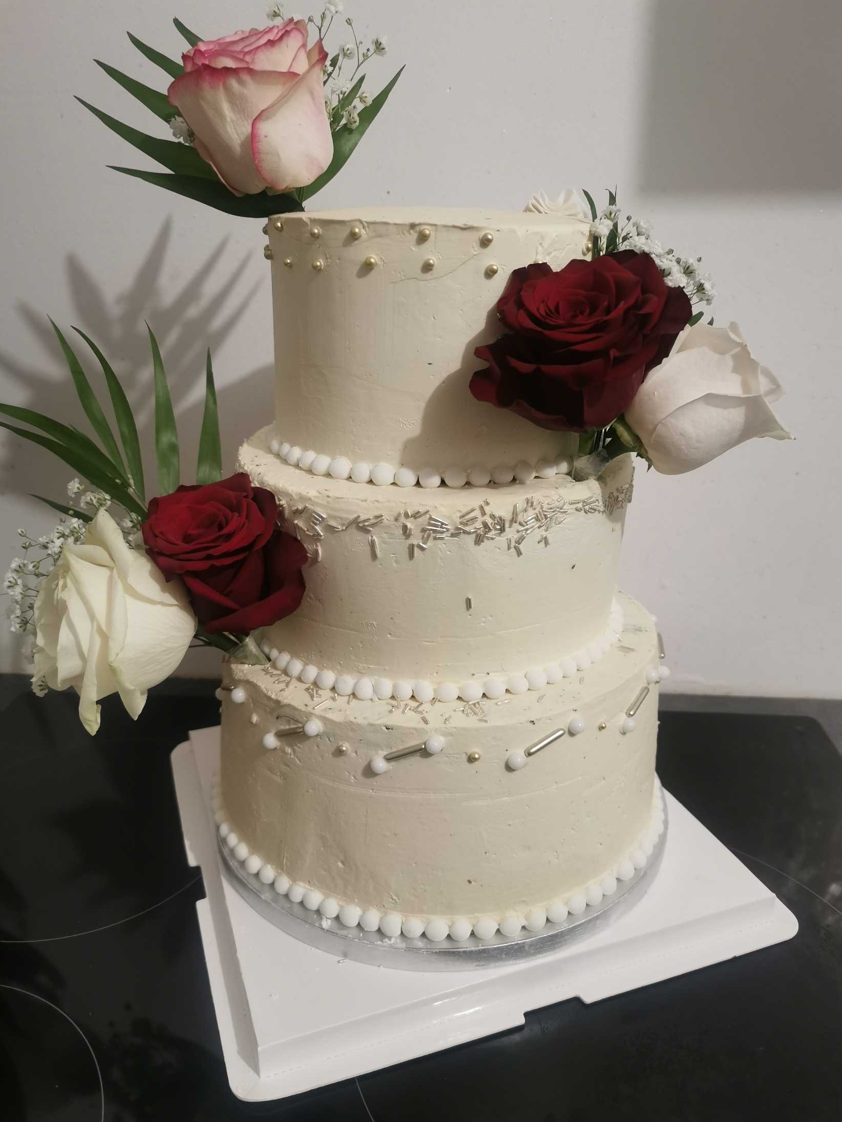 Le fameux Wedding cake ou gâteau de mariage à étages, composé de génoise ou de sponge cake, garni de crème et entouré de glaçage et de décors sucrés.