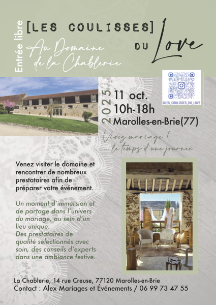 Mariez-Vous ! est partenaire de l’événement Les Coulisses du Love, une journée de portes ouvertes dédiée au mariage organisée par Alexandra d’Alex Mariages et Événements, le samedi 11 octobre 2025 à La Chablerie (77), un lieu aussi élégant qu’authentique.
