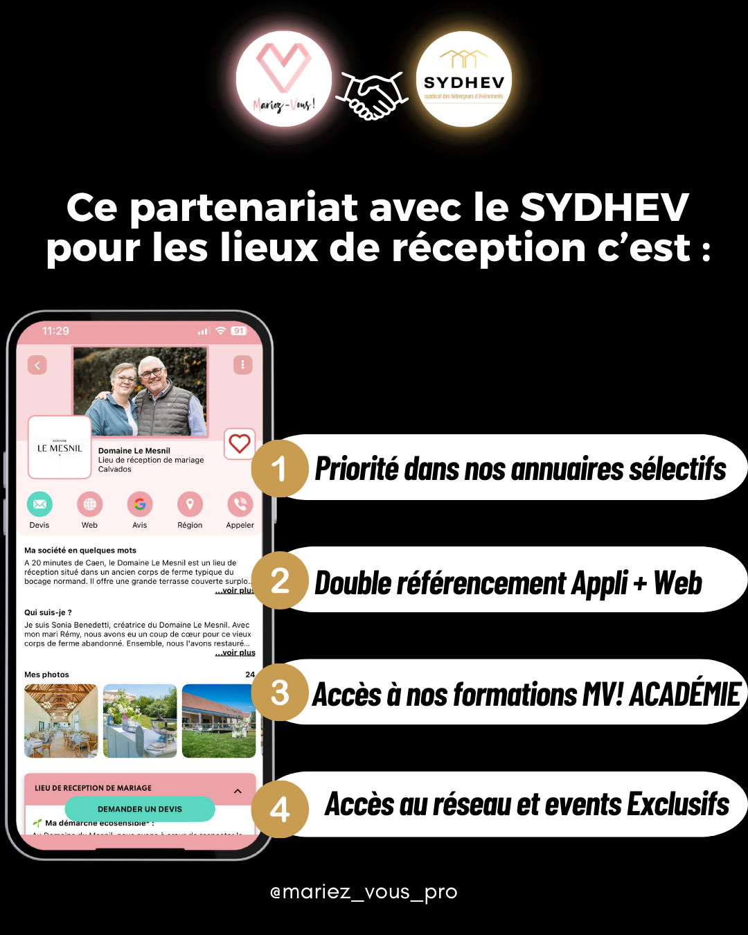 C’est dans ce contexte que Mariez-Vous ! officialise son partenariat avec le SYDHEV, le Syndicat des Hébergeurs d’Événements.