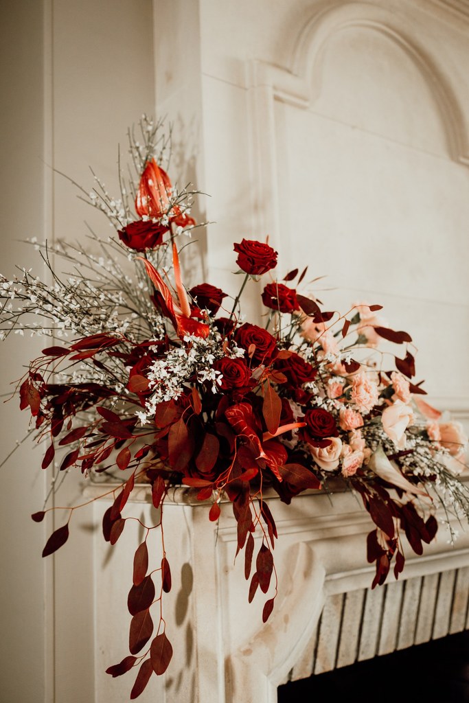 Les anthuriums rouges, roses bordeaux, œillets poudrés et feuillages teintés créent un décor intense, chaleureux et plein d’élan.