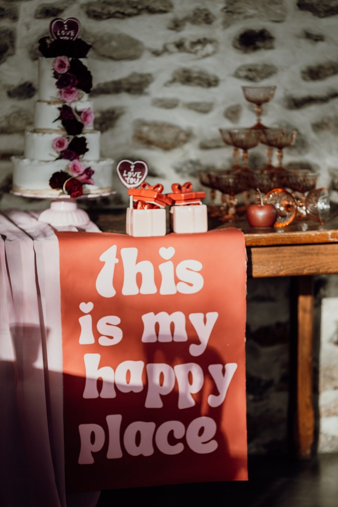 Des accessoires malicieux : sucettes en forme de cœur, lunettes rouges, guirlande “This is my happy place”